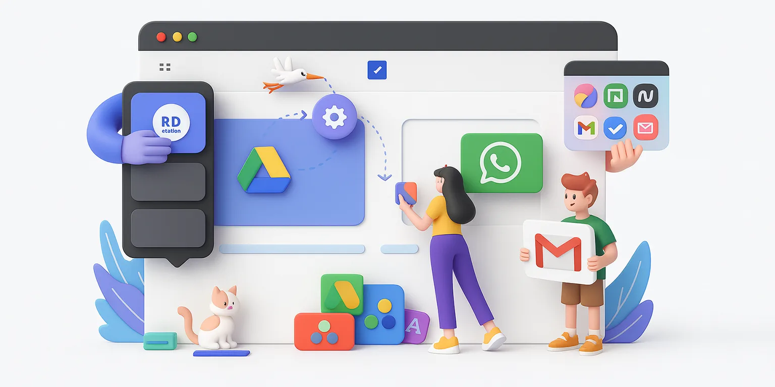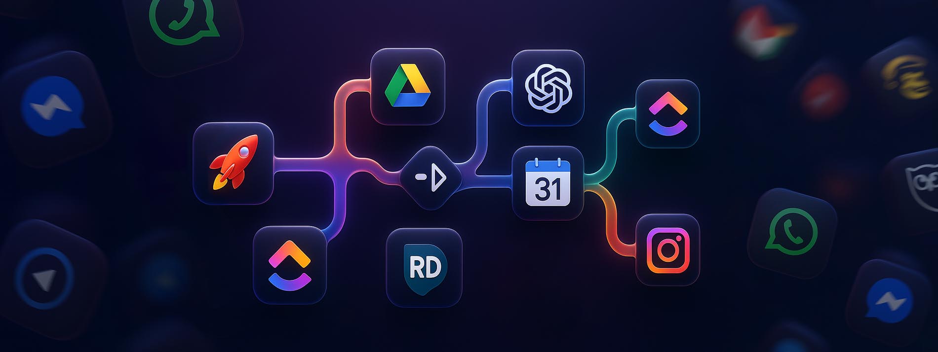 Conecte tudo: WhatsApp, e-mail, CRM, ERPs, RD Station, Asaas, Notion, Slack, Google Sheets, Zapier, Make, n8n e dezenas de outras ferramentas que você já usa no dia a dia. Tudo fluindo de forma automática e integrada.